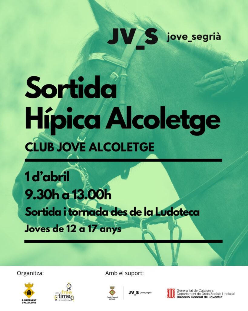 Des del Club Jove d’Alcoletge, dins la programació del Club Jove 2026, s'organitza una sortida a la Hípica d'Alcoletge amb acompanyament de l'equip monitors/es de Free time!