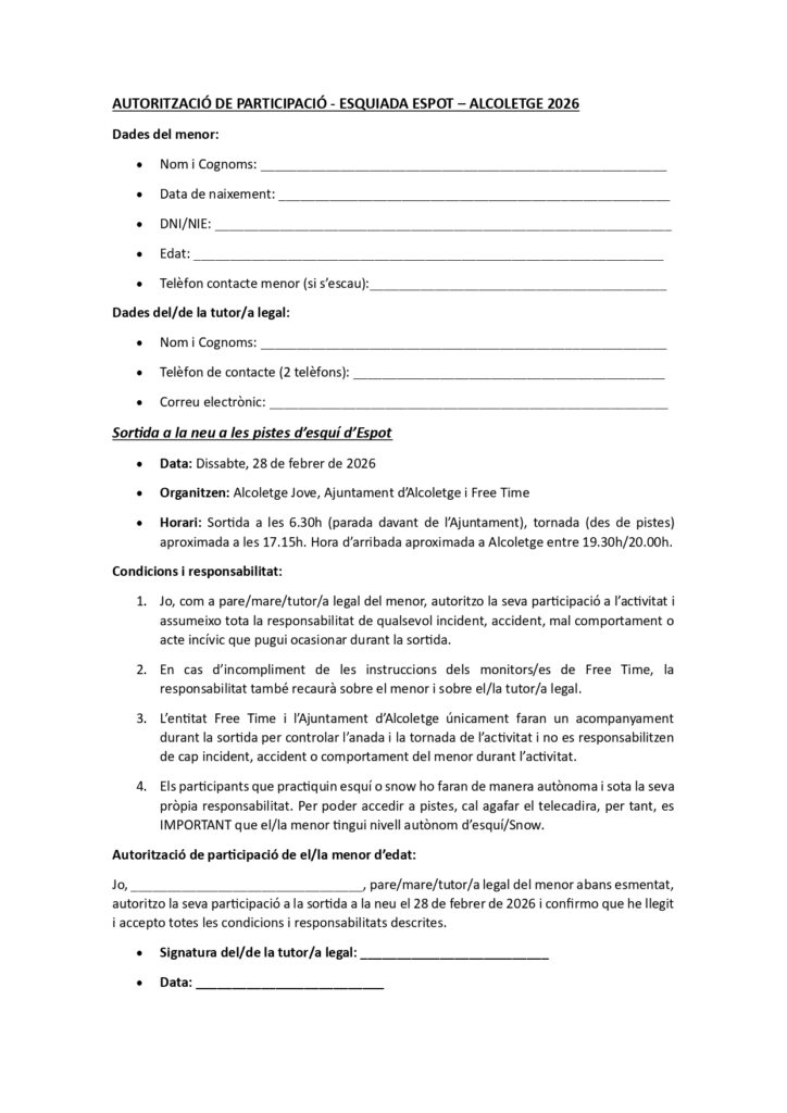 - Joves de 12 a 17 anys: autorització expressa dels tutors/es legals. ➡️ Aquests/es joves estaran acompanyats/des durant la sortida per monitors/es de Free Time! Tot i així, la responsabilitat de participació en la sortida recaurà als pares/mares/tutors/es legals.