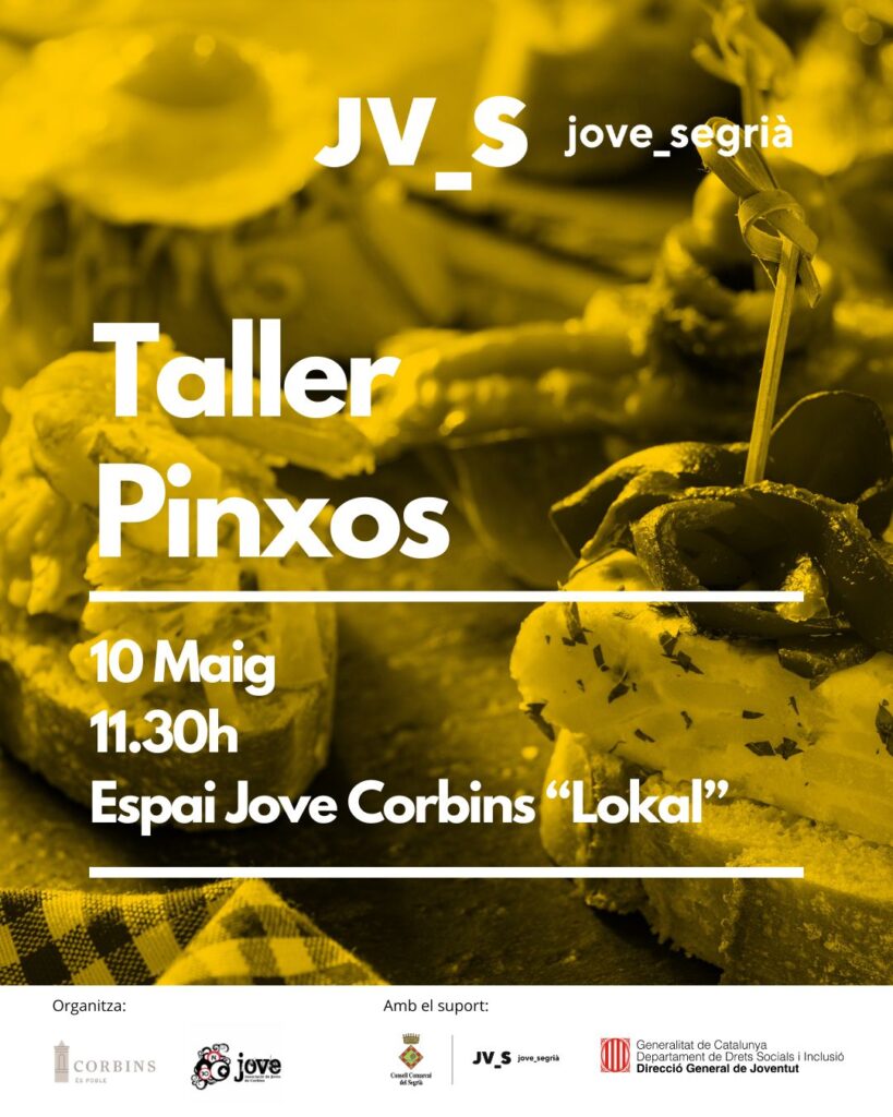 L’Associació Juvenil de Corbins, conjuntament amb l’Ajuntament de Corbins, us porten dins del Pla Local de Joventut 2026 un taller de pinxos per llepar-se’n els dits! 🤤💛